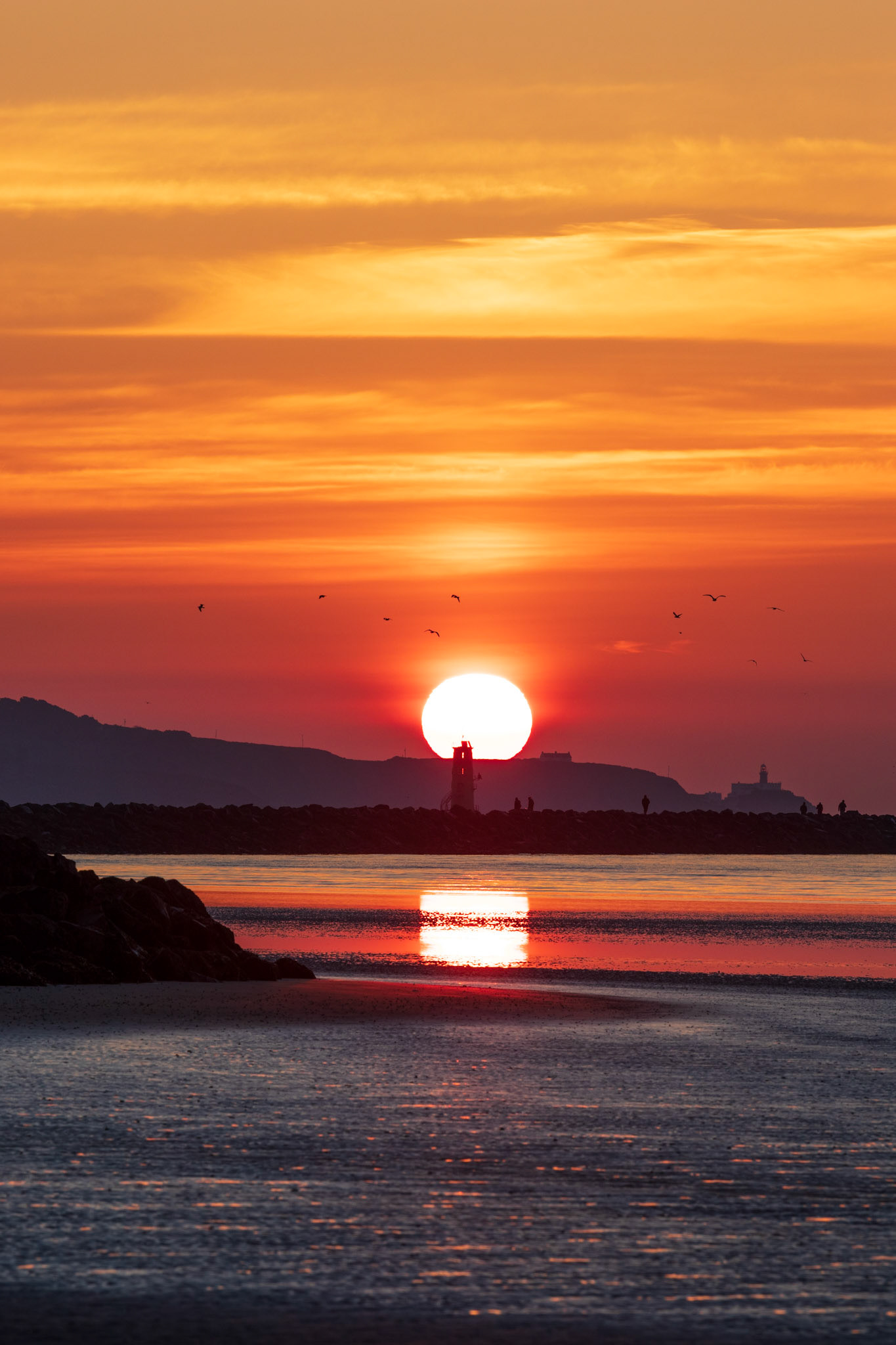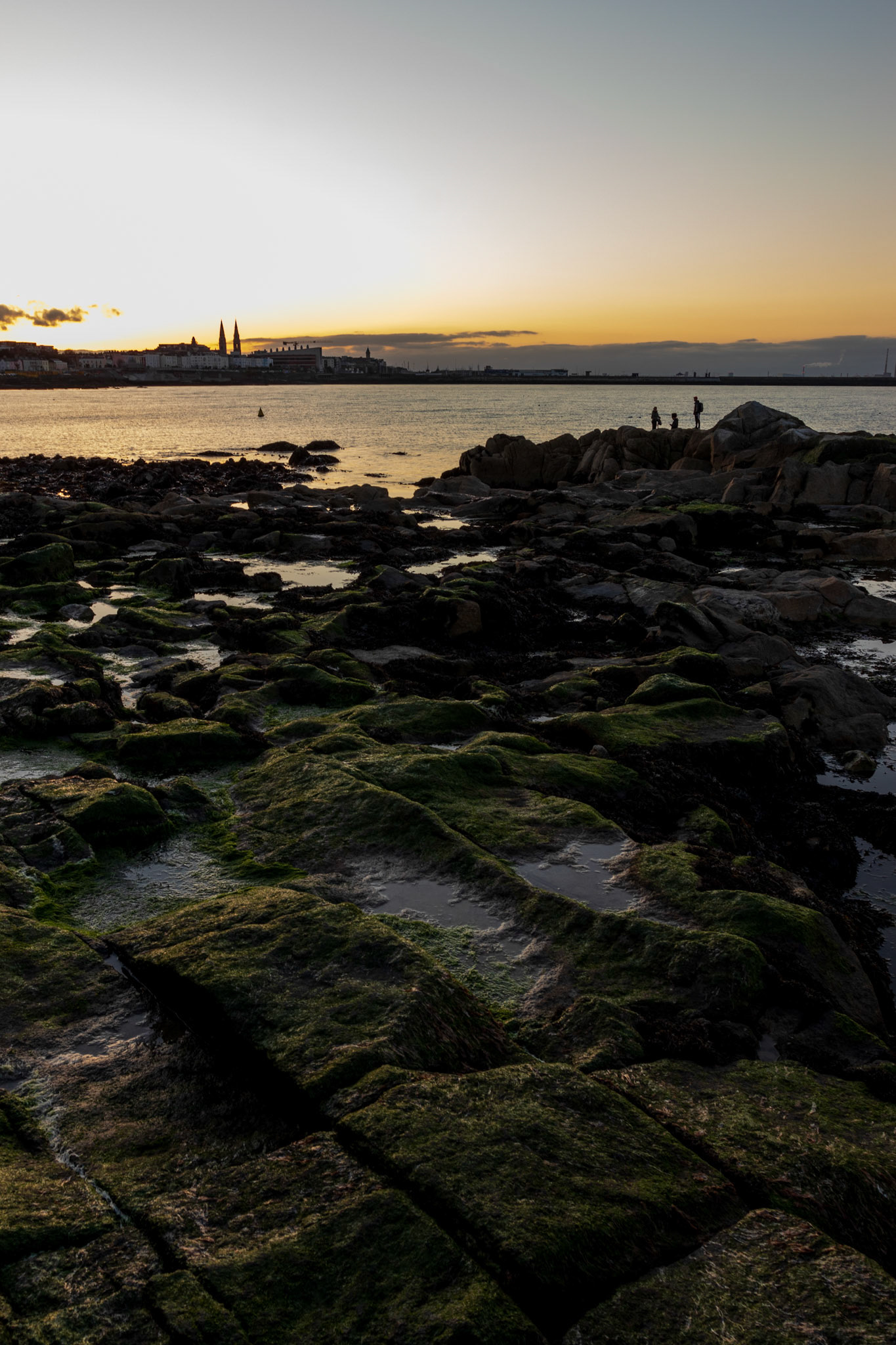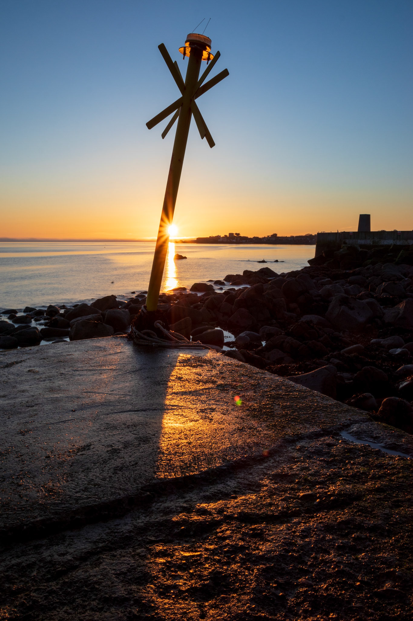 Soft tones at sunset in the harbour. Lighthouses on the pier walls looking through Dublin Bay to the Poolbeg towers
