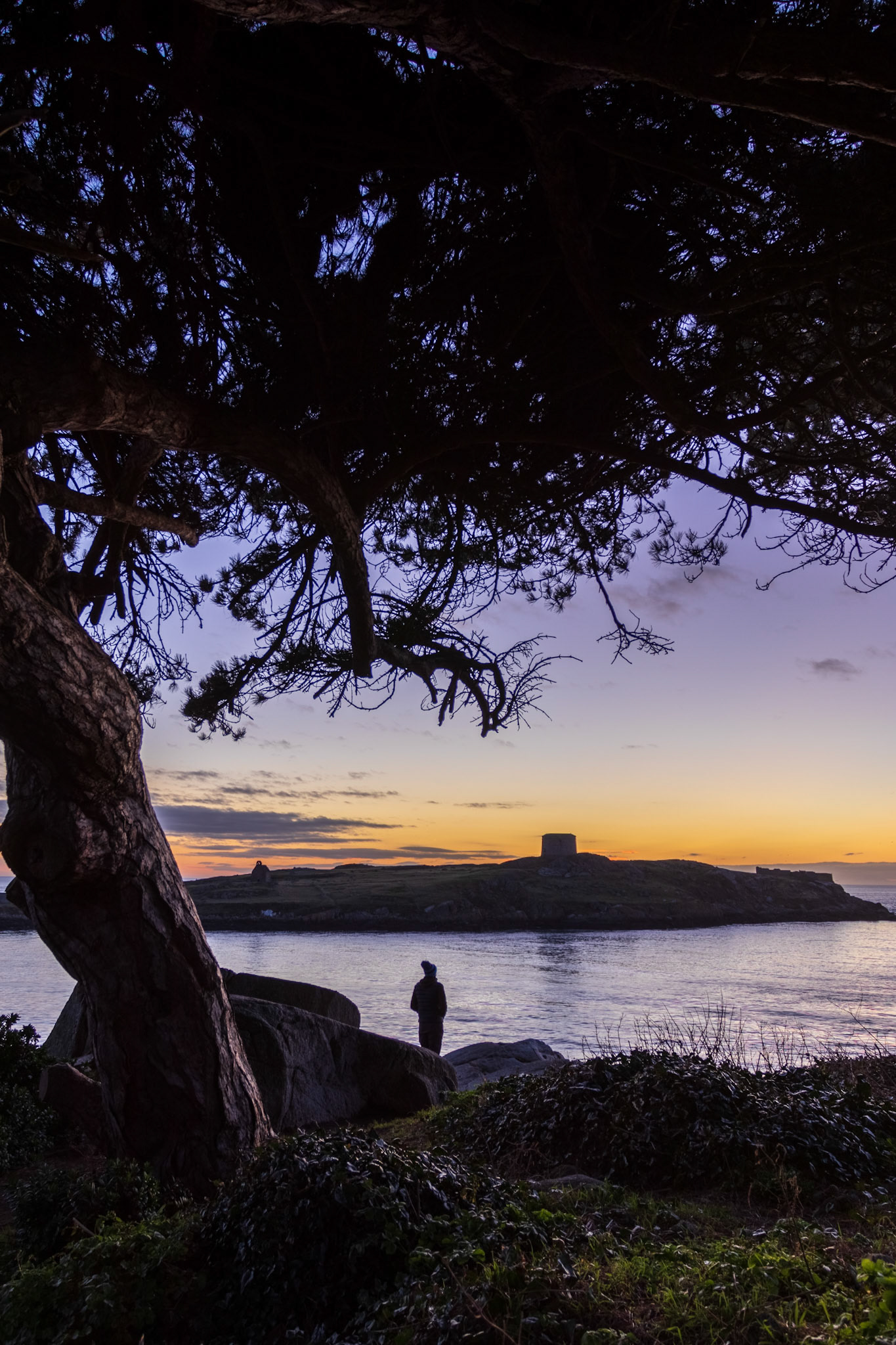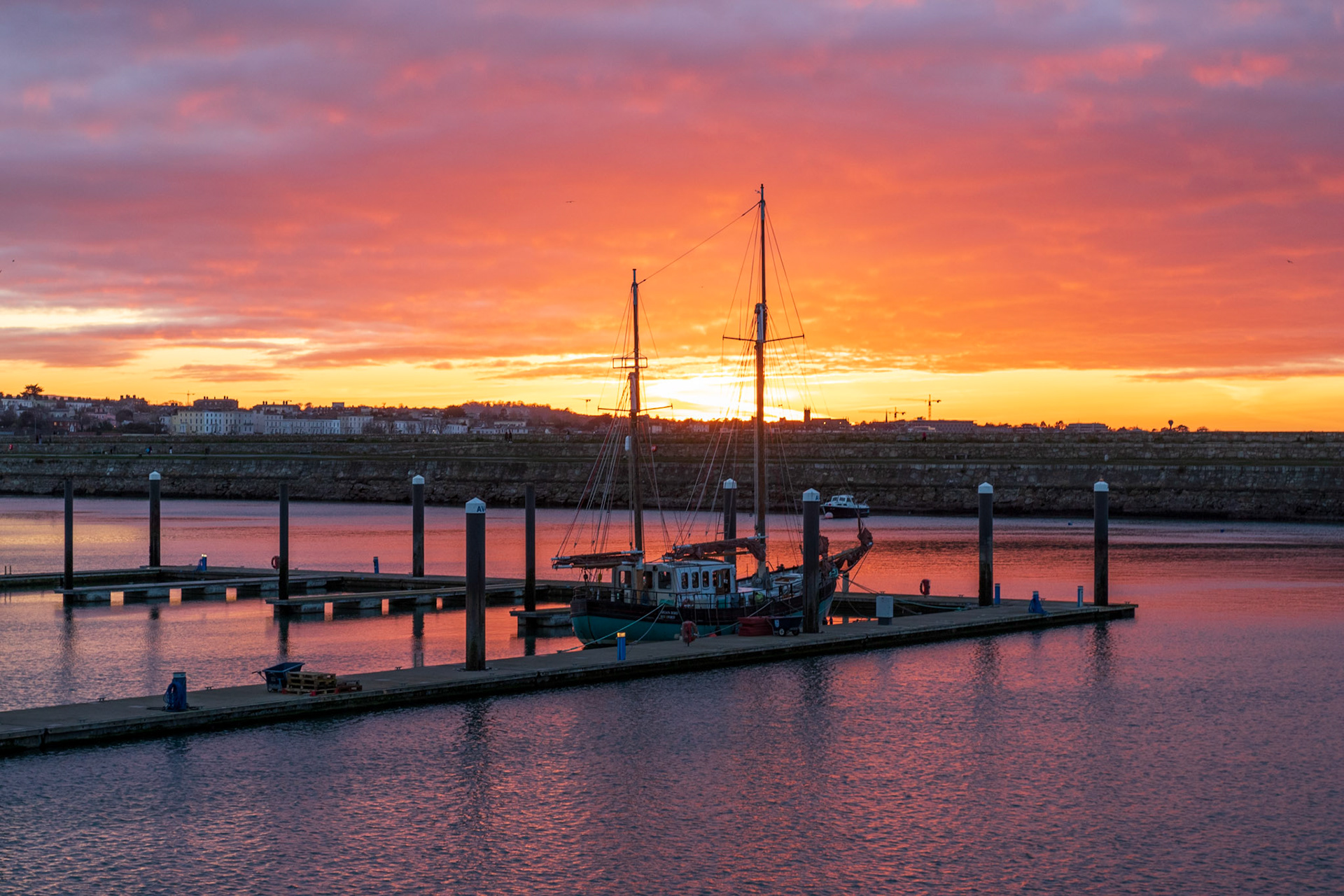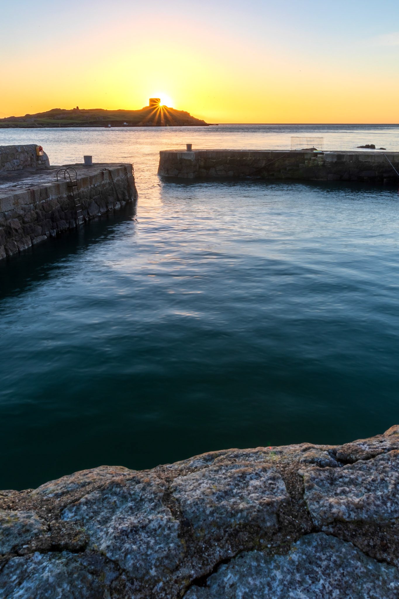 Soft tones at sunset in the harbour. Lighthouses on the pier walls looking through Dublin Bay to the Poolbeg towers